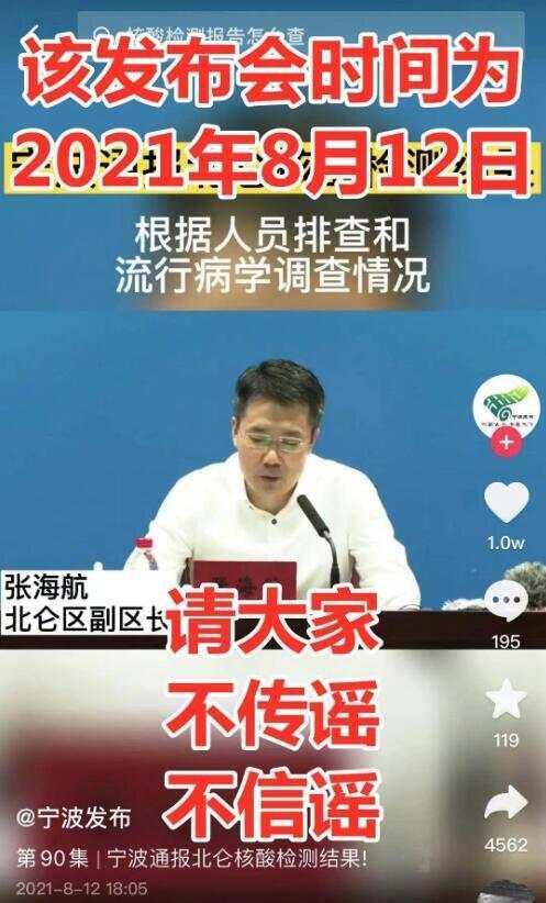 2022年1月1日,一则《宁波通报北仑核酸检测结果》的短视频在各微信群流传。据记者向区疫情防控办了解,该视频发布时间为2021年8月12日。请广大群众不要恐慌,不信谣,不传谣,自觉做好个人防护。